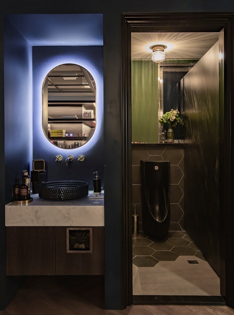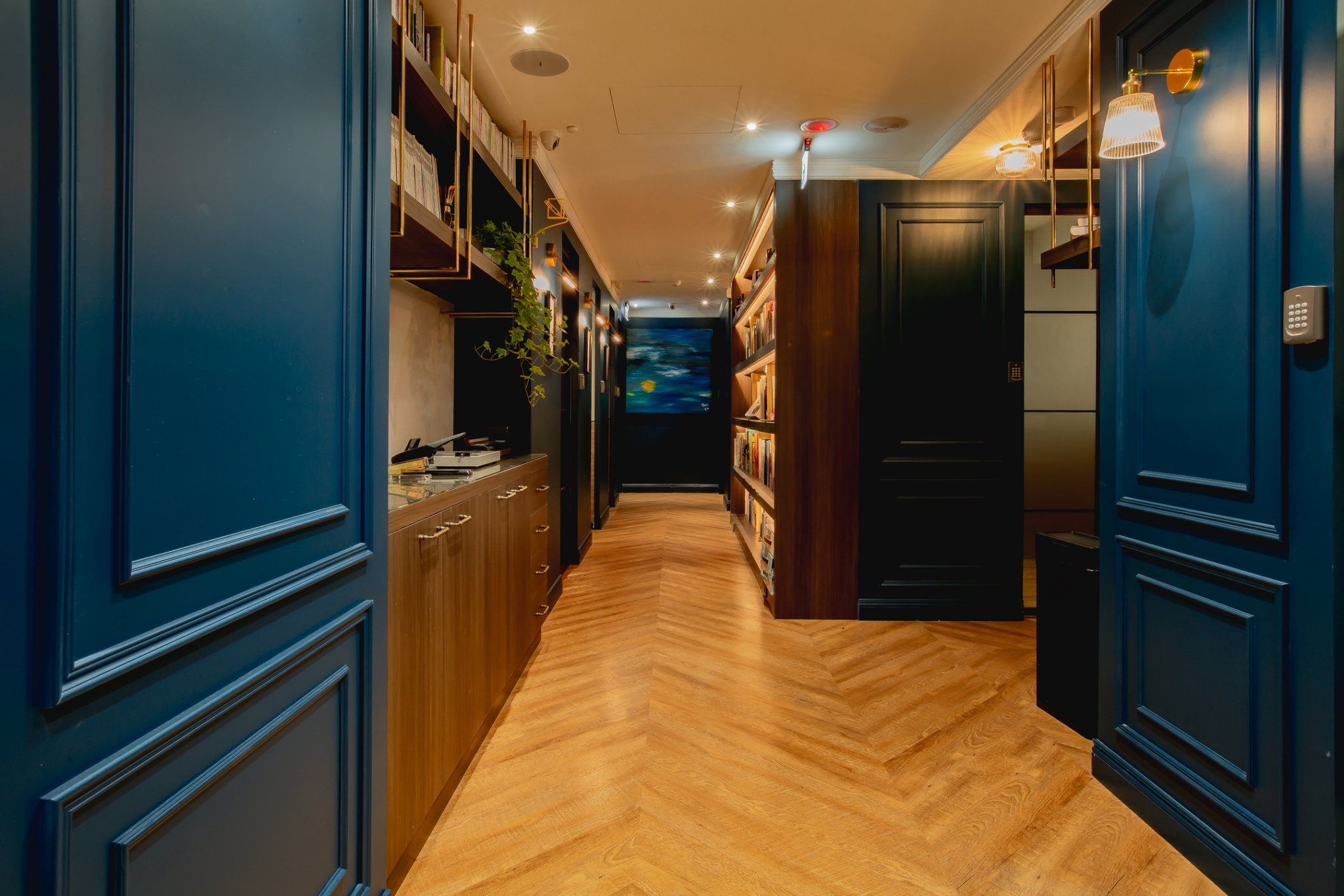 主要材料牆面色彩:藏青色牆面,營造沉穩背景與視覺焦點。