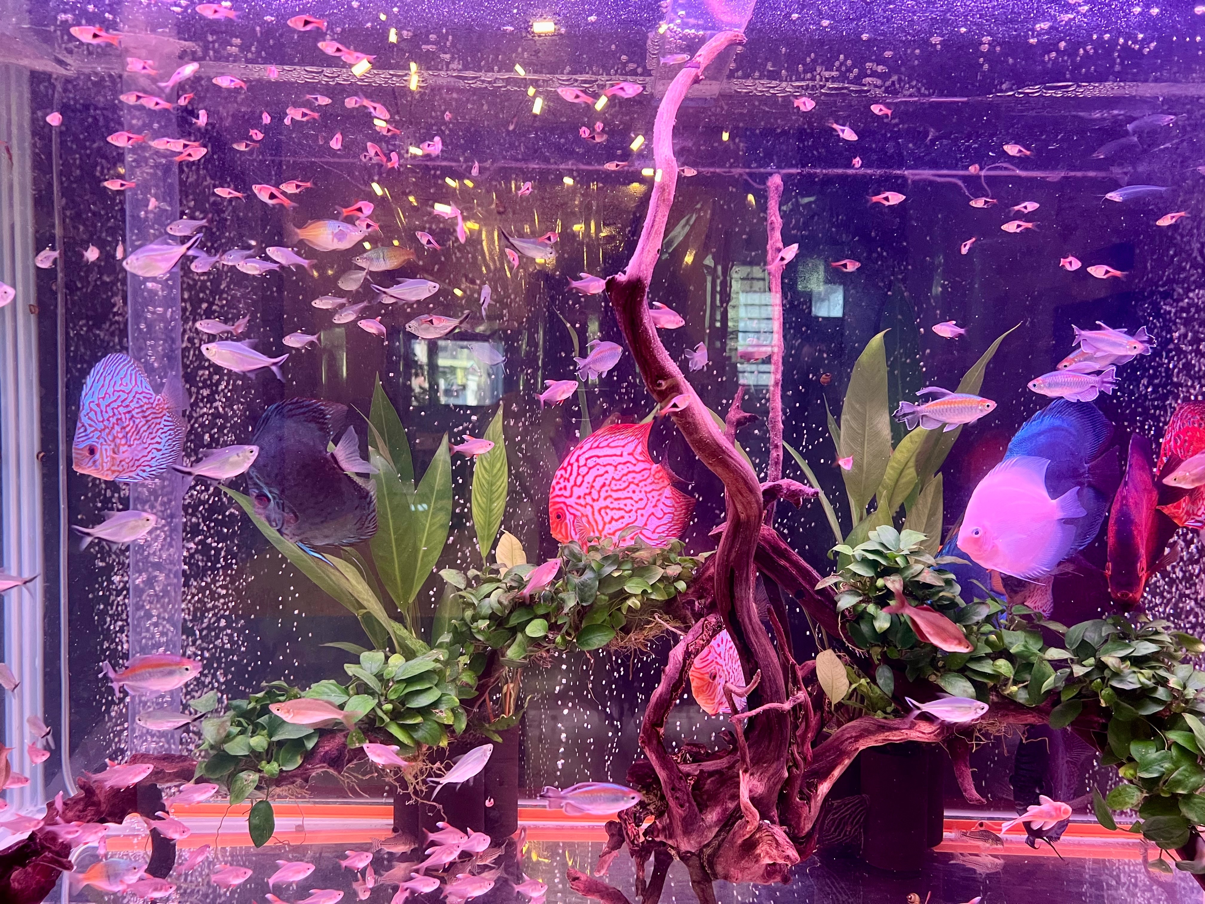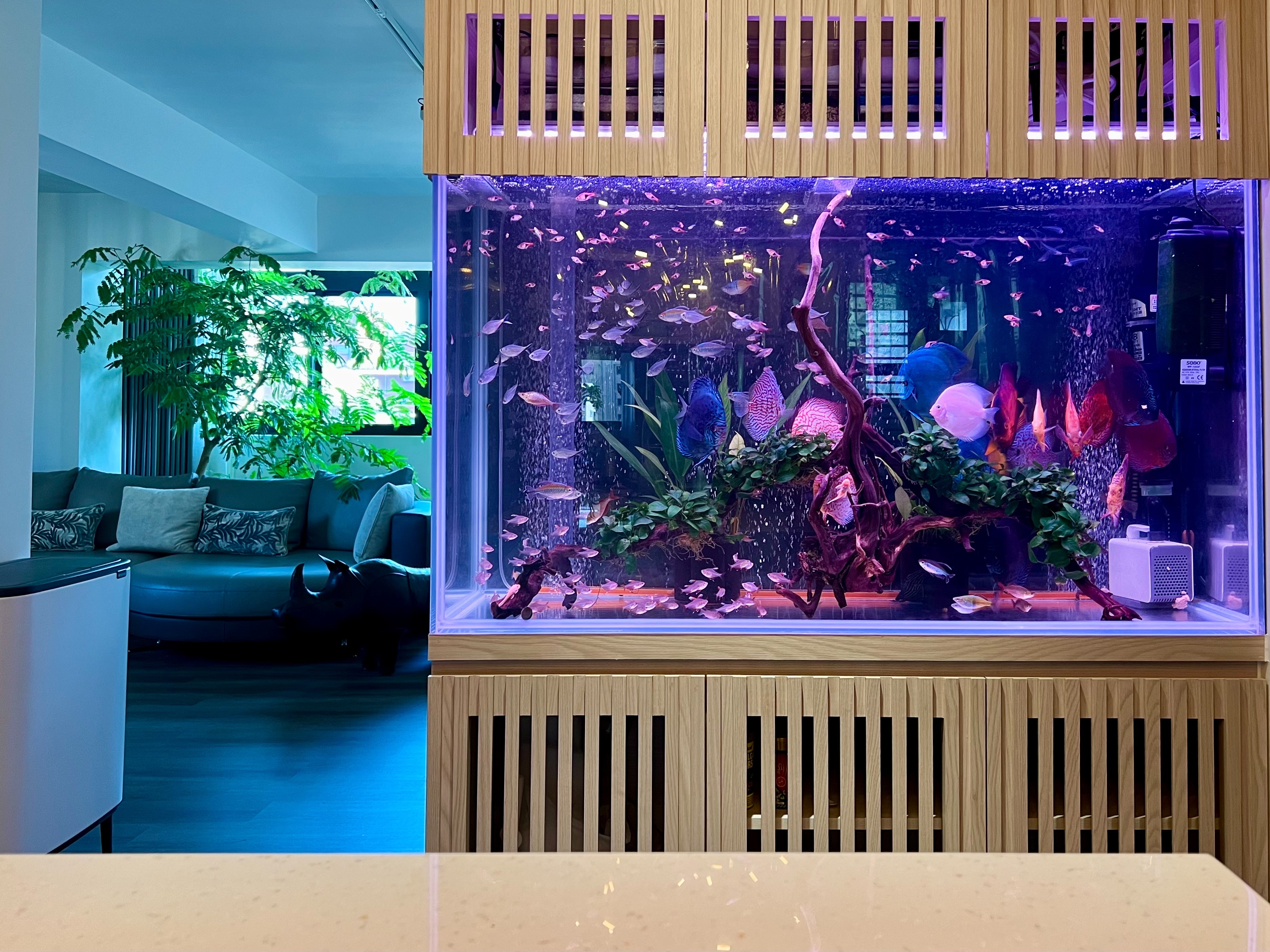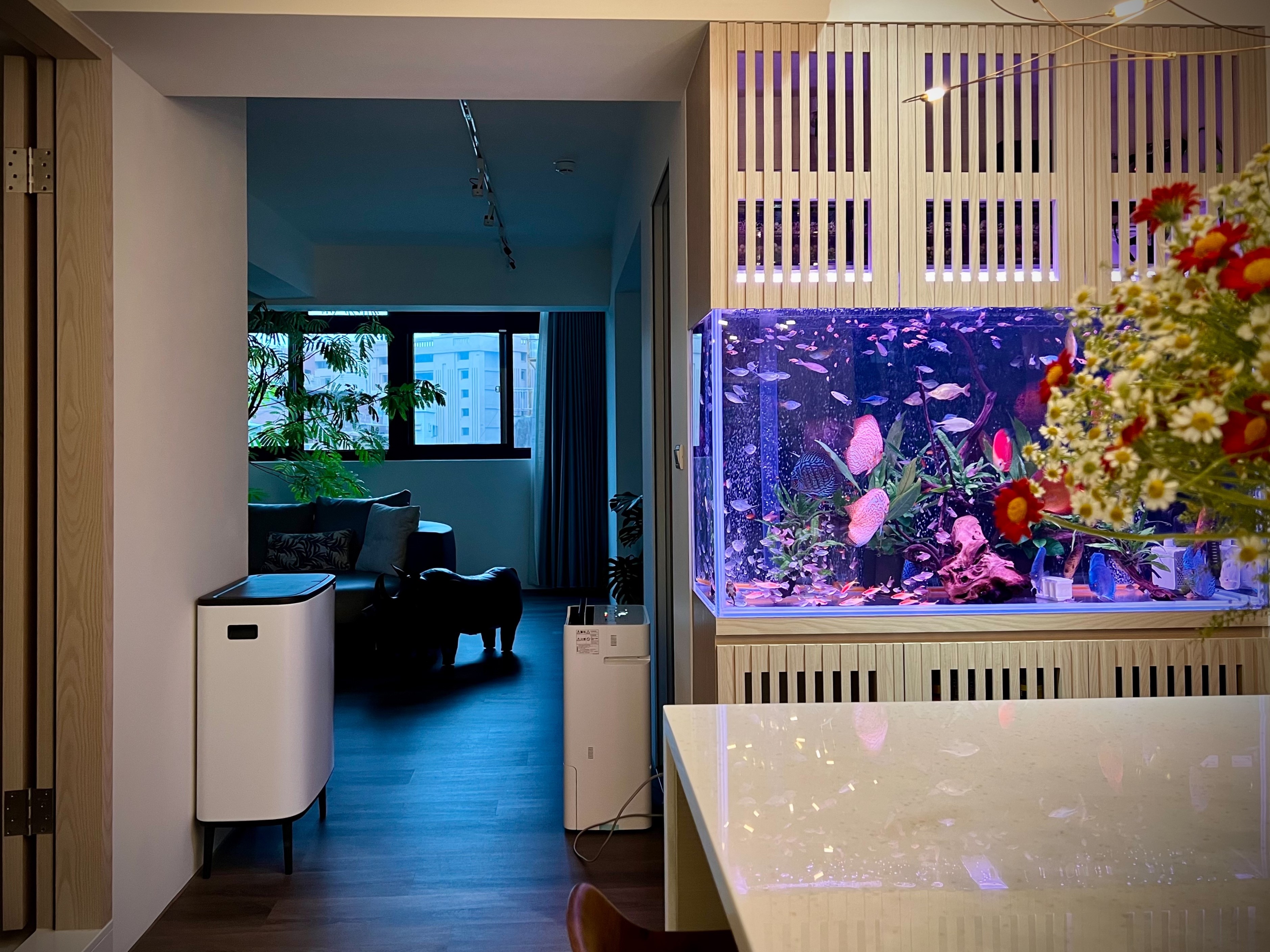 • 主要材料以柔和、低飽和度為主,營造清新、明亮的空間氛圍。 - 主色調:白色、米色、淺灰色:作為主色調,搭配簡潔俐落的家具設計,提升空間的明亮感與延伸感。 - 大面窗設計:保留原有窗戶或擴大窗面,引入自然光。 - 植栽點綴:加入室內植物,以森林綠增添生氣與綠意。 - 木質色系:融入自然元素,增添溫度與自然感。 - 魚缸設計:突顯海水魚的鮮豔色彩與珊瑚造景,打造迷你海底世界,成為空間焦點。