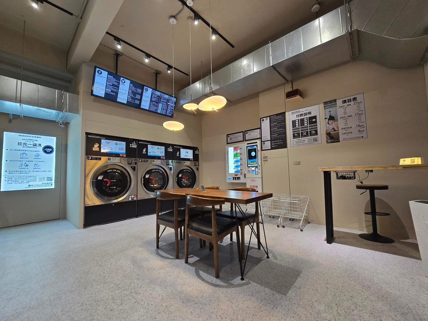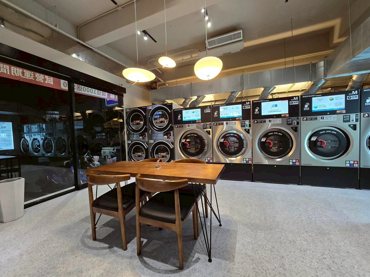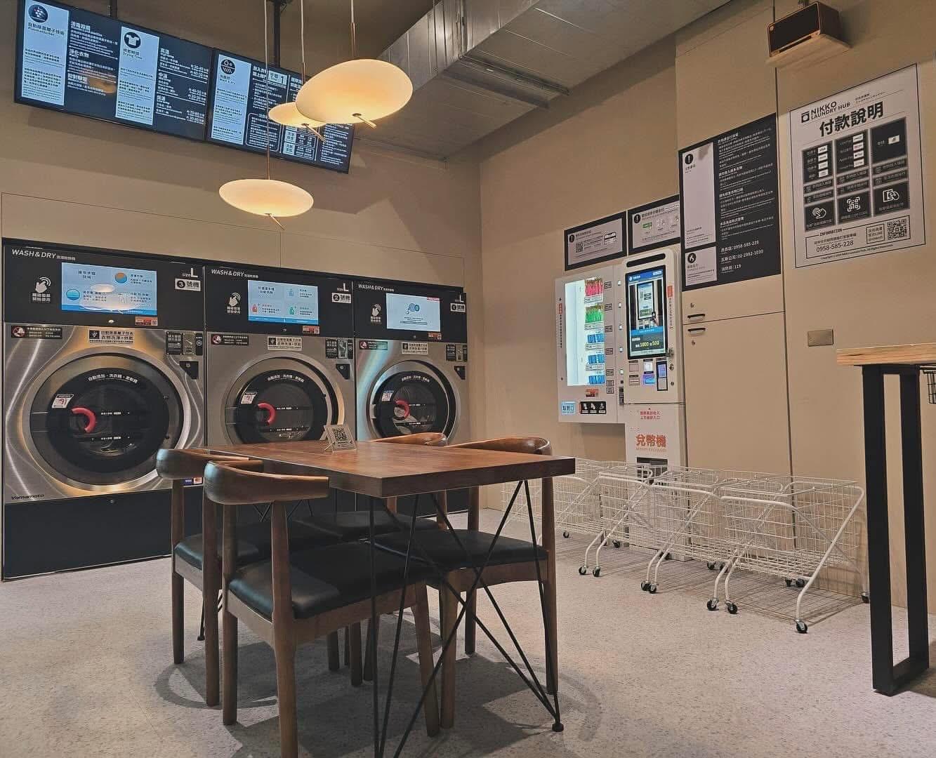 • 室內格局洗衣烘乾機排布區、自助販賣機、座位休憩區、收納推車區