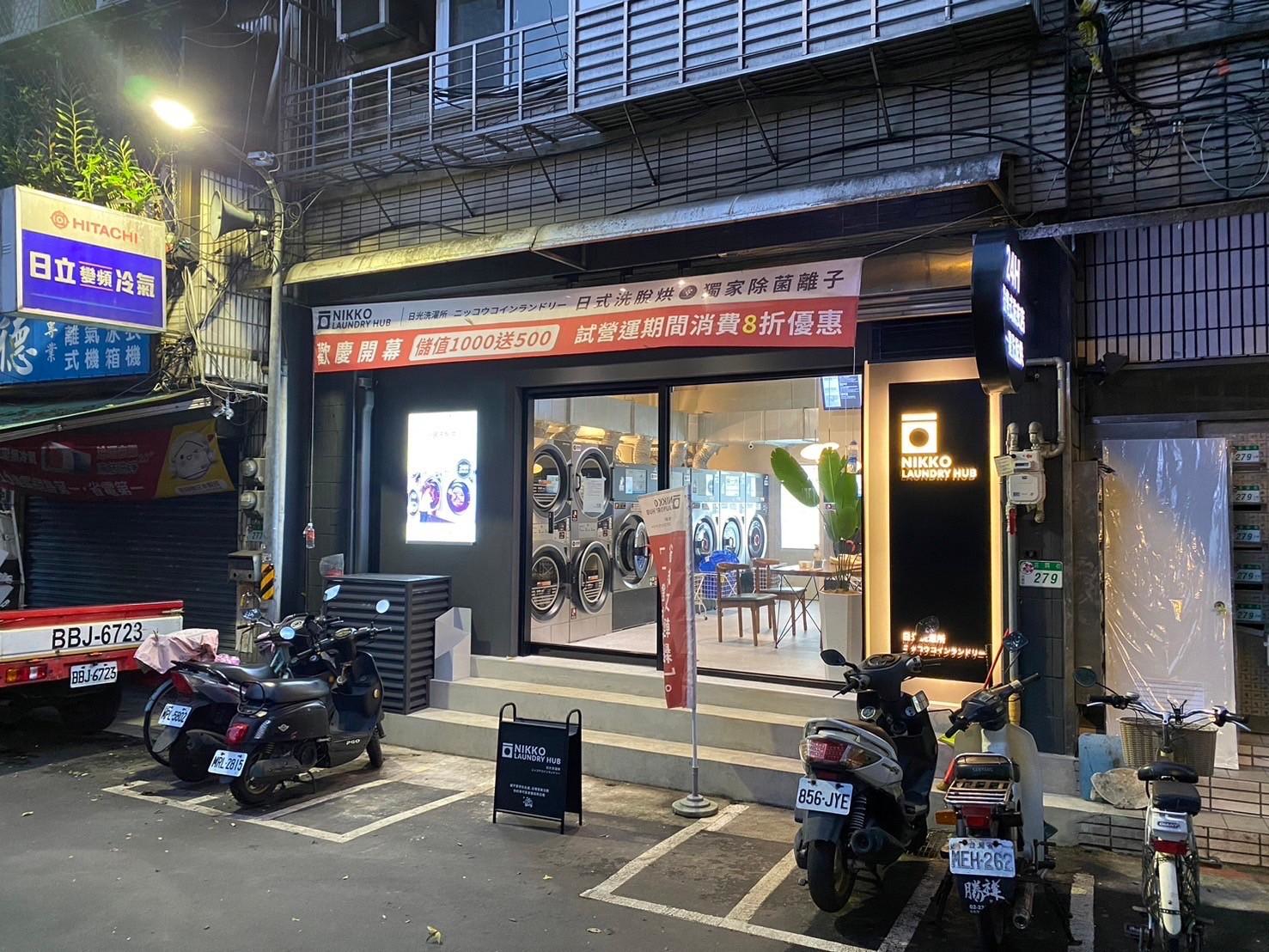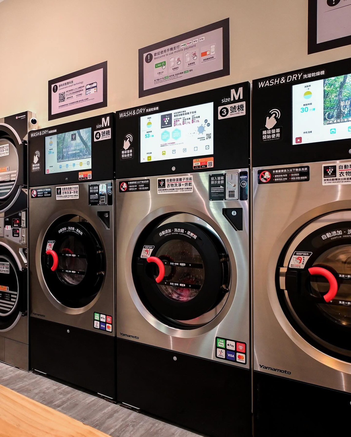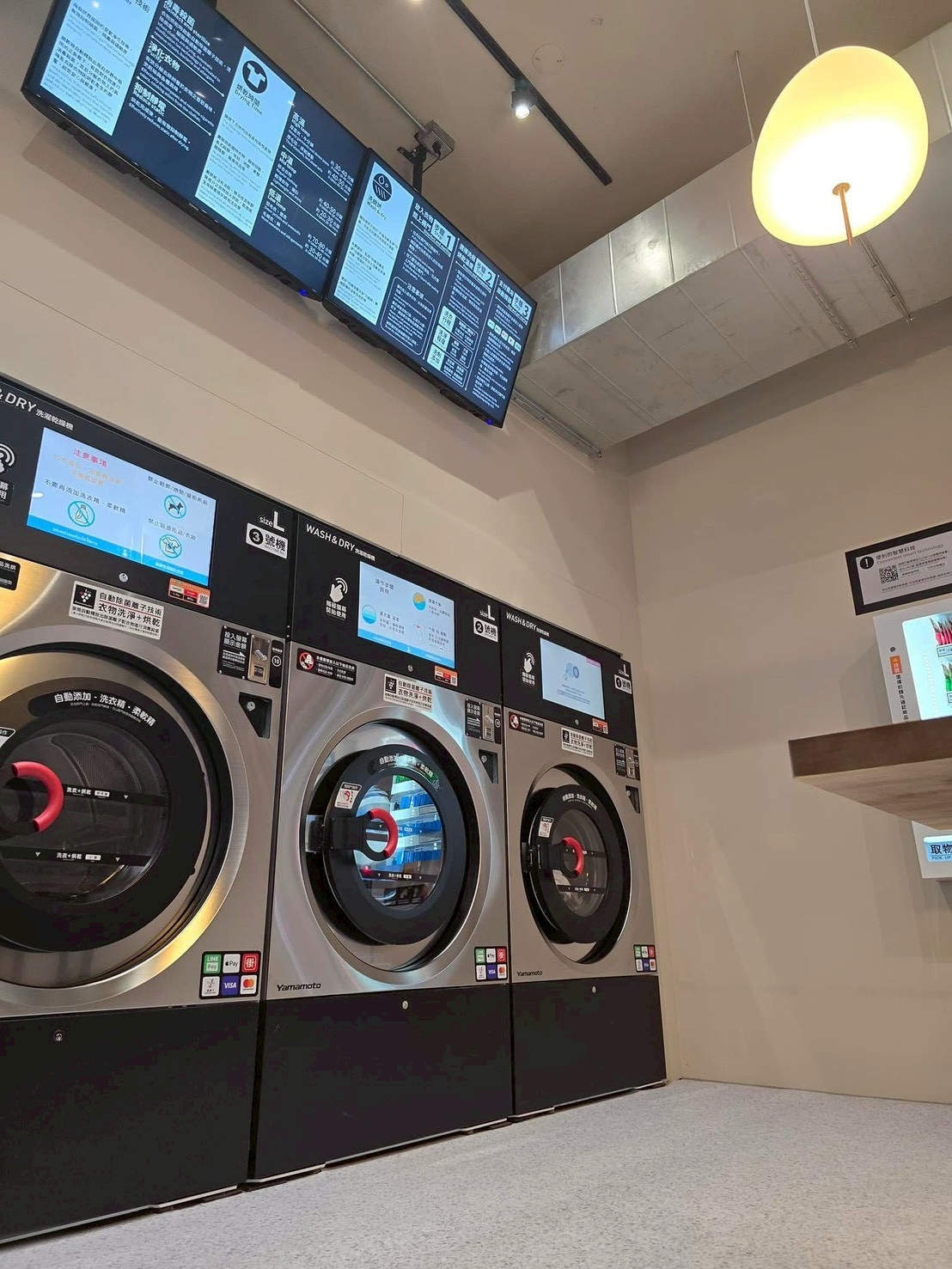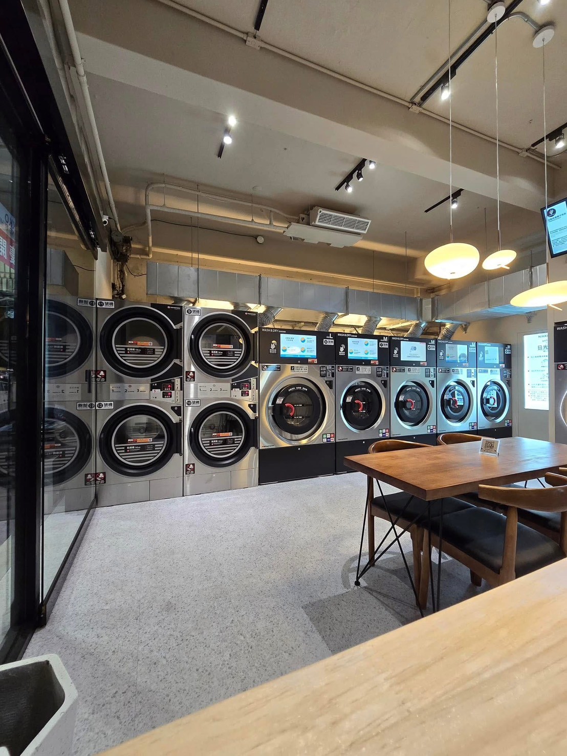 • 室內格局洗衣烘乾機排布區、自助販賣機、座位休憩區、收納推車區